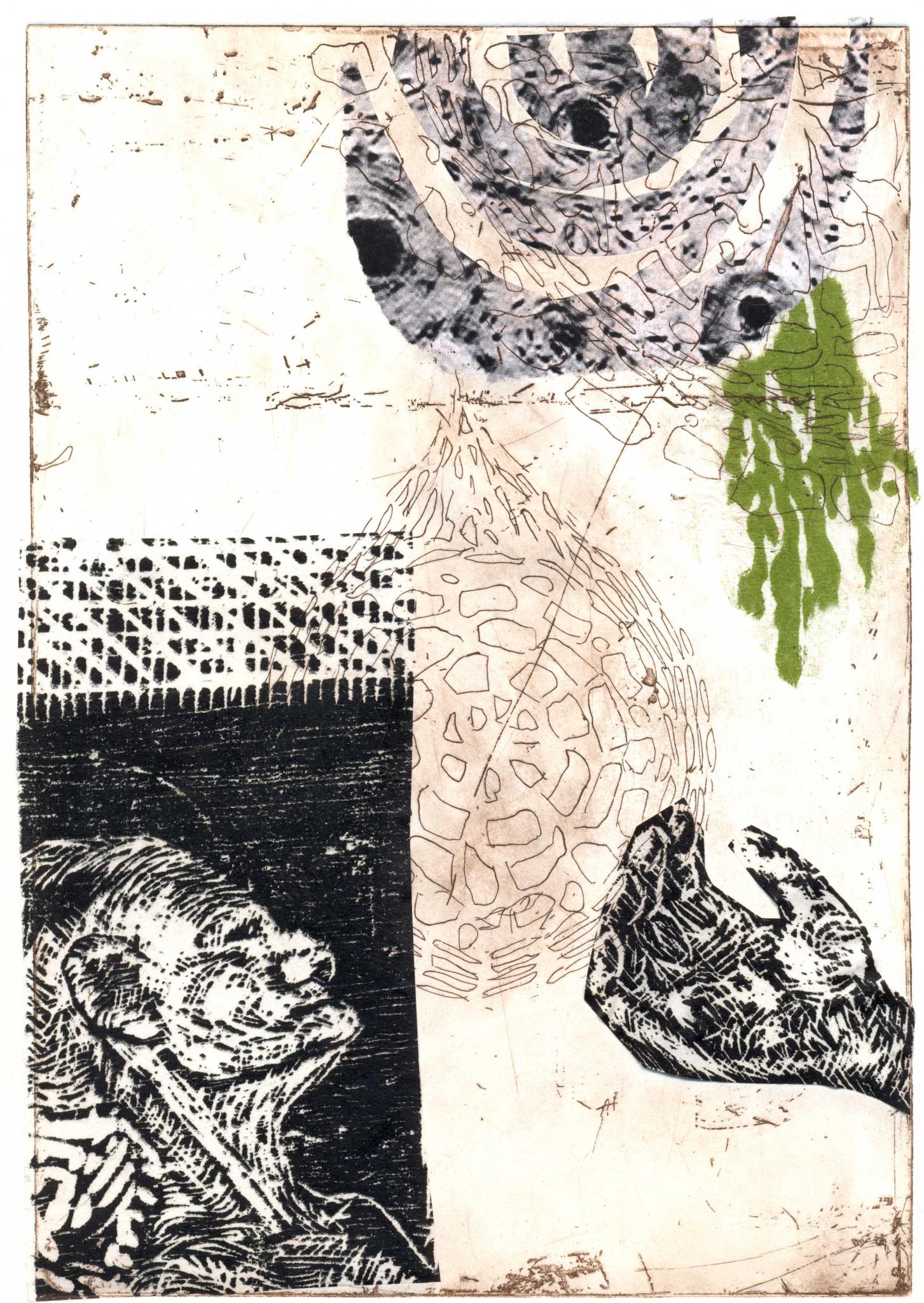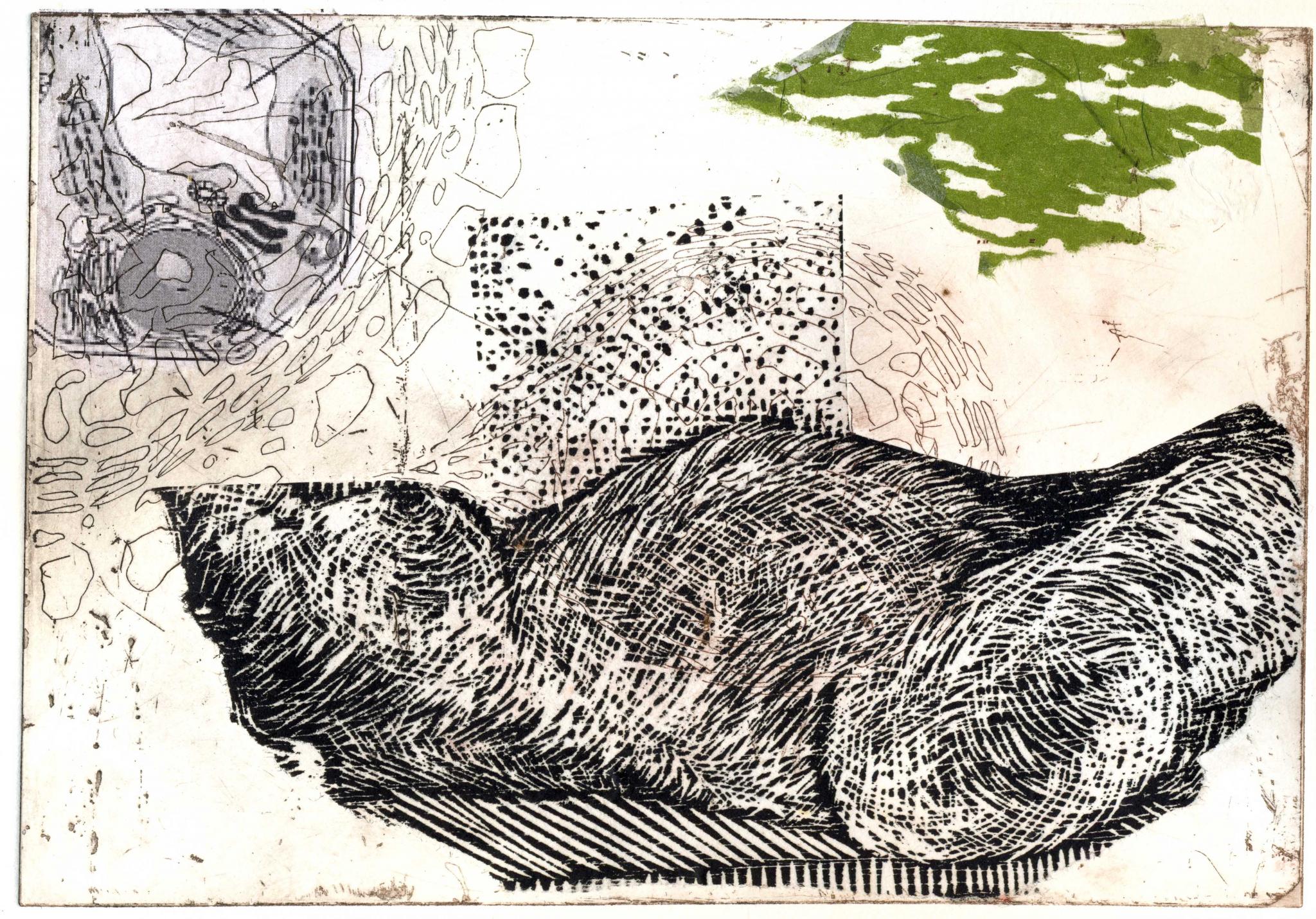 For mig er grafik billedkunstens svar på rå poesi - Konturer af snit, sansning af sværte, fragmenter af form og streger. Jeg har været medlem af Tryk2 siden værkstedet startede i 2007.